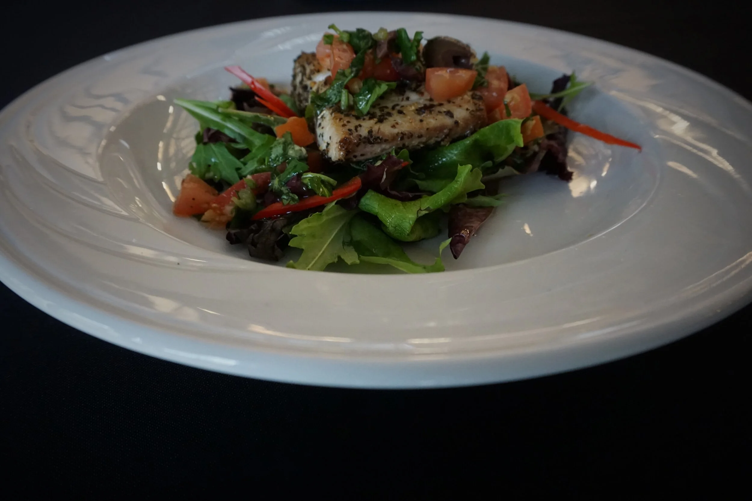 SICILLIAN STYLE MAHI MAHI WITH AN OLIVE-TOMATO RELISH OVER BABY GREENS